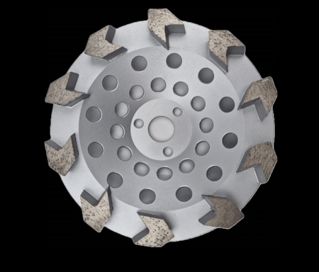 The Arrow Cup Wheel is an aggressive grinding wheel suited for quick material removal. Best suited for floor preparing tasks such as glue and paint removal.